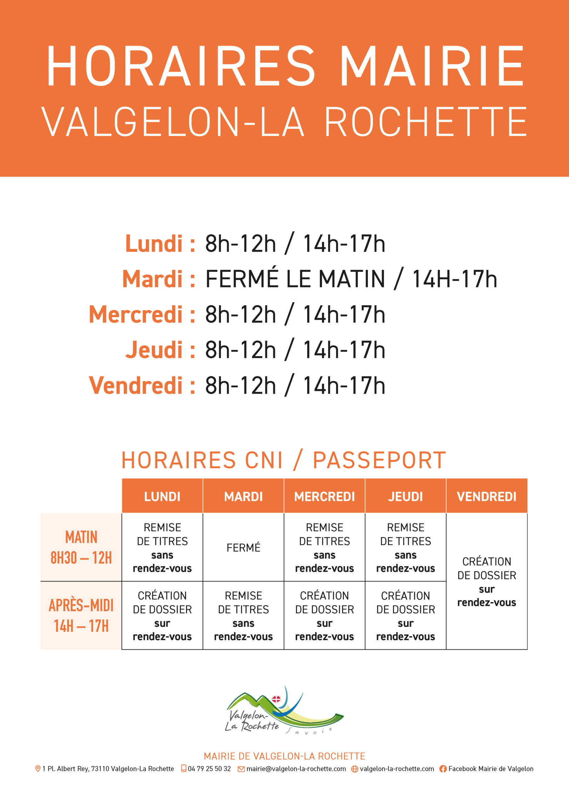 Lundi, mercredi, jeudi et vendredi : 8h à 12h et de 14h à 17h