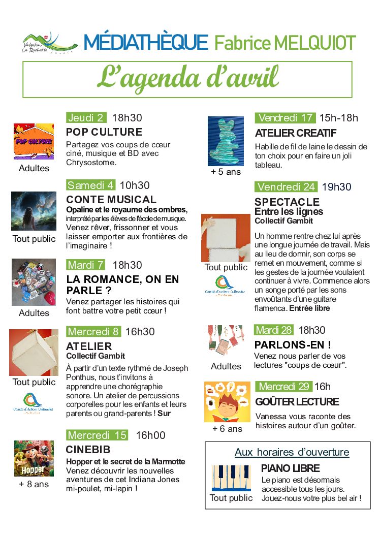 La Médiathèque Fabrice Melquiot est pleine d’animations, proposant une variété d’activités pour tous les publics. Consultez l’agenda pour ne rien manquer pour le mois d’avril !